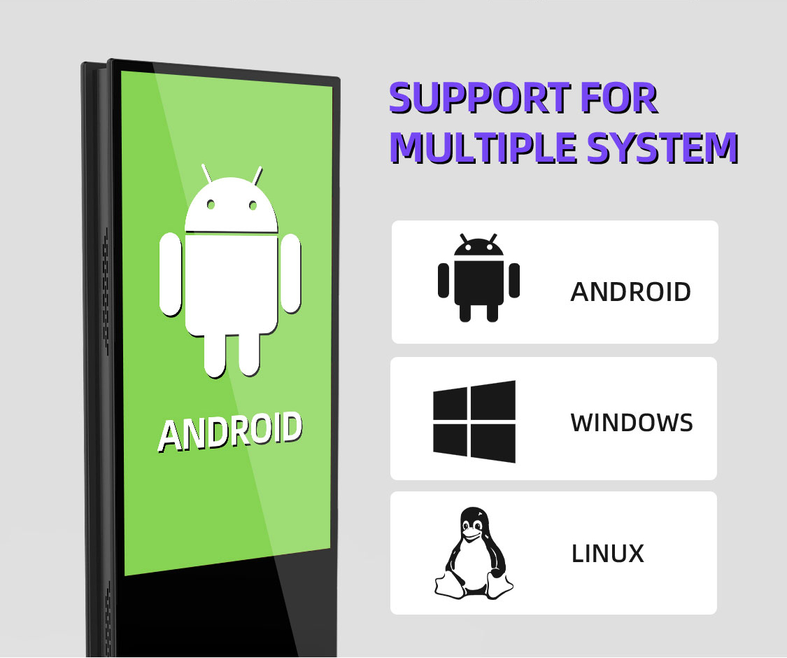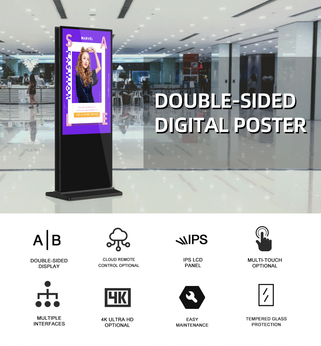 The Double-Sided LCD Digital Signage offers high-brightness screens on both sides, ensuring clear, vivid content from every angle. Ideal for malls, airports, and retail spaces, it supports 24/7 operation and remote content updates, providing an energy-efficient, space-saving solution for impactful dual-sided advertising.