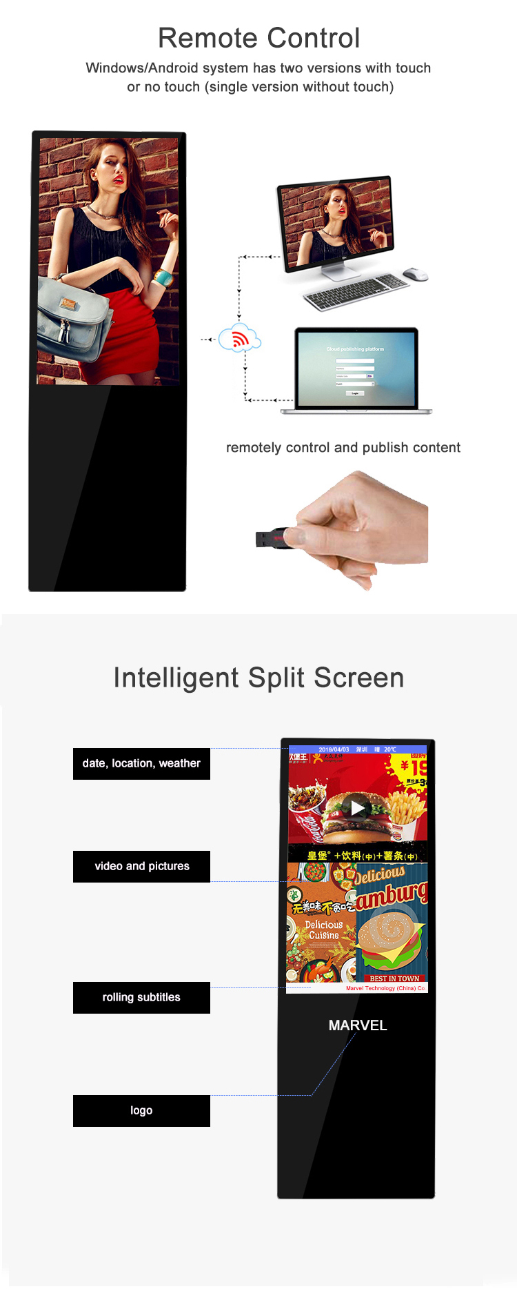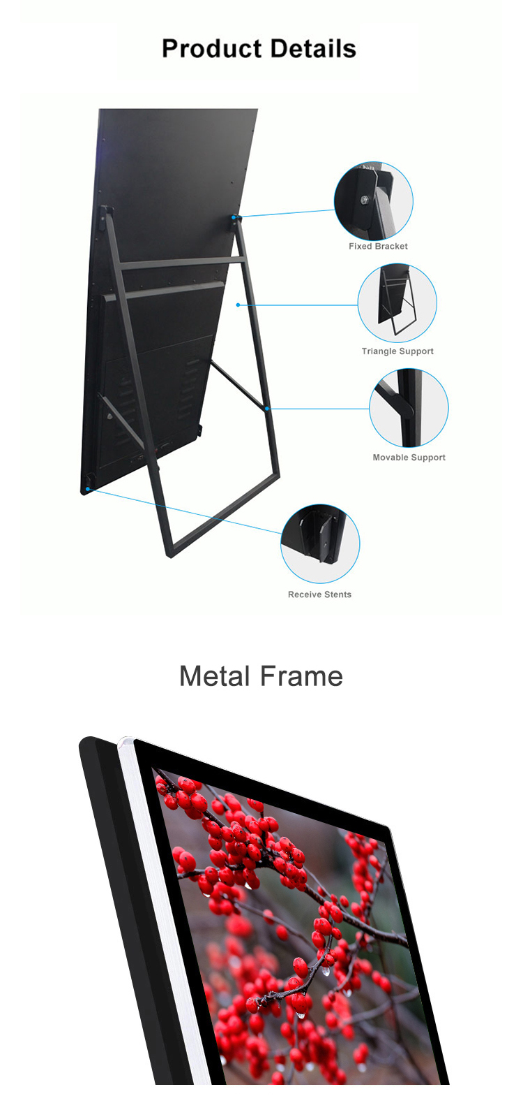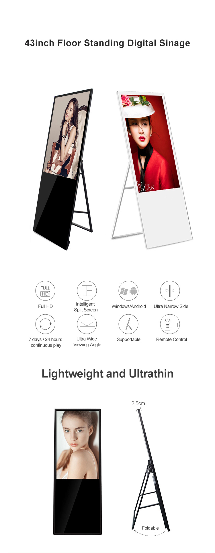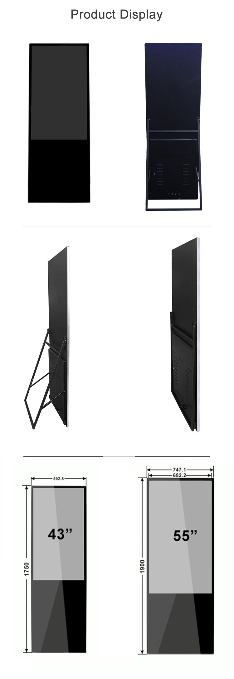 这款43英寸便携式液晶数字标牌采用超薄设计,拥有全高清分辨率和安卓操作系统。它内置媒体播放器并集成SDK,是智能电梯、零售店和活动场所的理想之选,可随时随地提供灵活独立的数字广告体验。