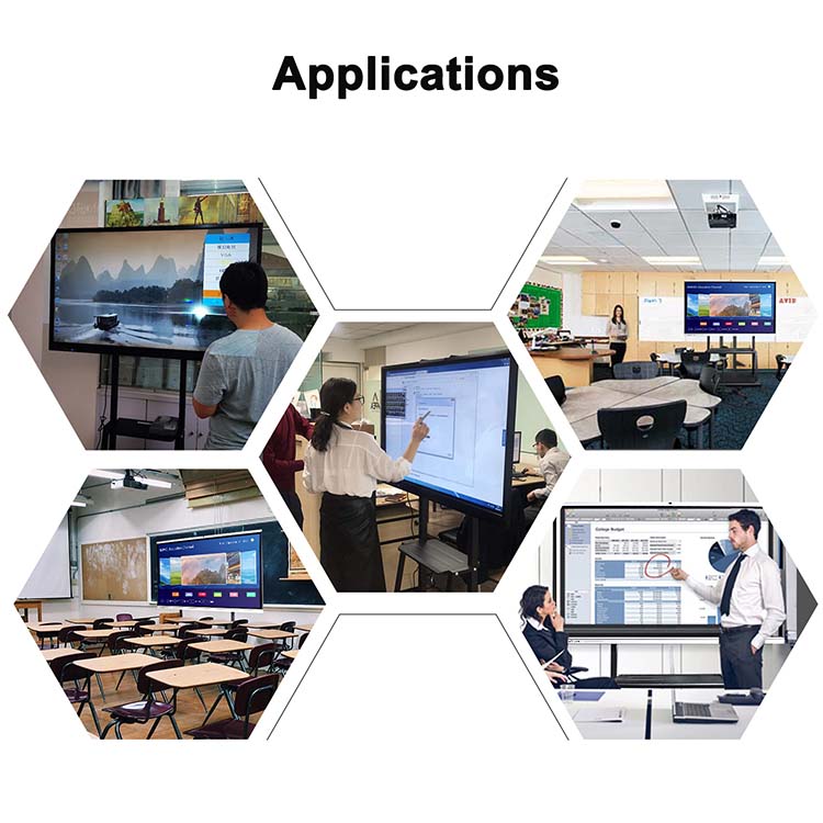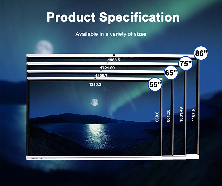 55、65 和 75 英寸智能触摸屏配备 Android 和 Windows 双操作系统,使用灵活。它们支持无线屏幕共享、多点触控互动和高清视觉效果,是教室和培训中心的理想选择,能够打造引人入胜且高效的互动学习环境。