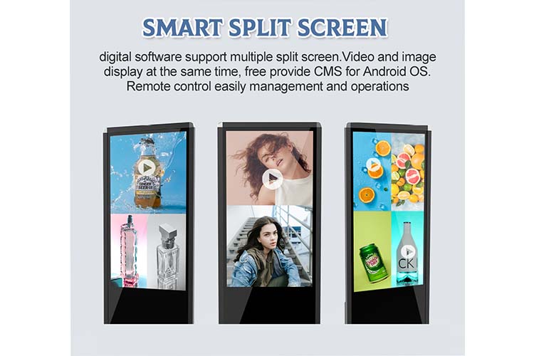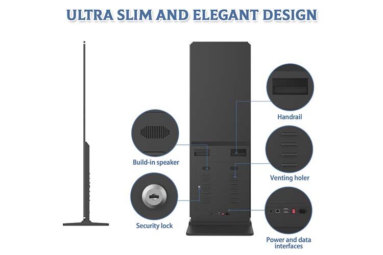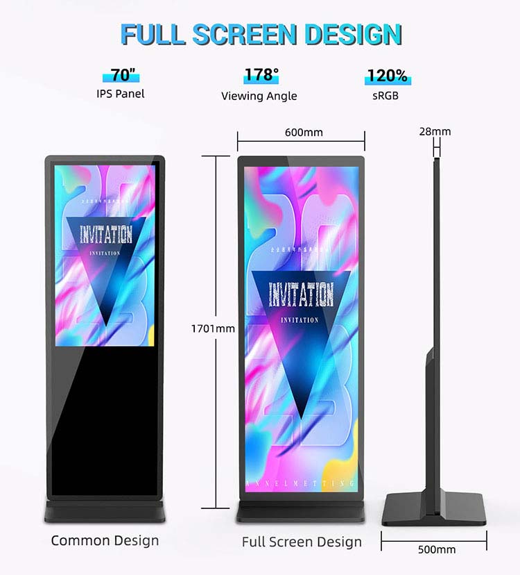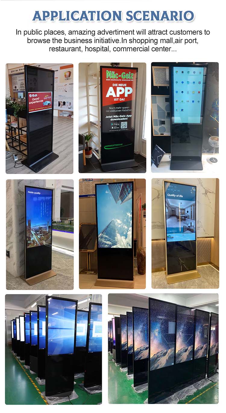 这款 75 英寸室内 LED 海报广告机配备高清数字显示屏,并可选配触摸屏互动功能。它专为零售、酒店和展览设计,支持壁挂式或立式安装。这款可定制的 LED 广告机拥有生动的视觉效果和现代风格,是打造具有影响力的室内广告和品牌推广的理想之选。