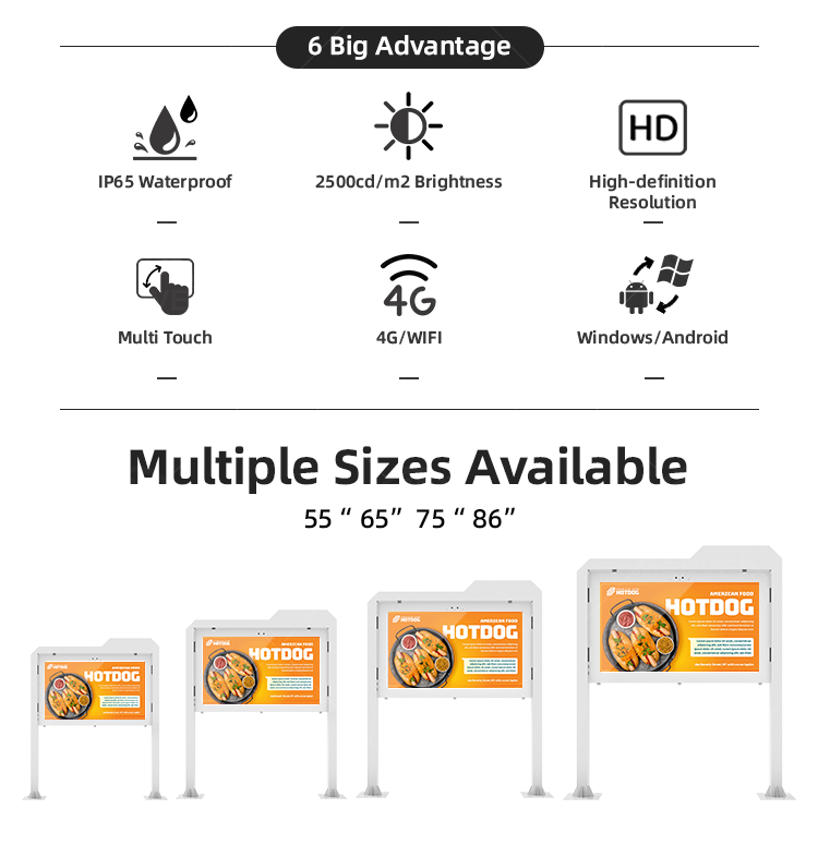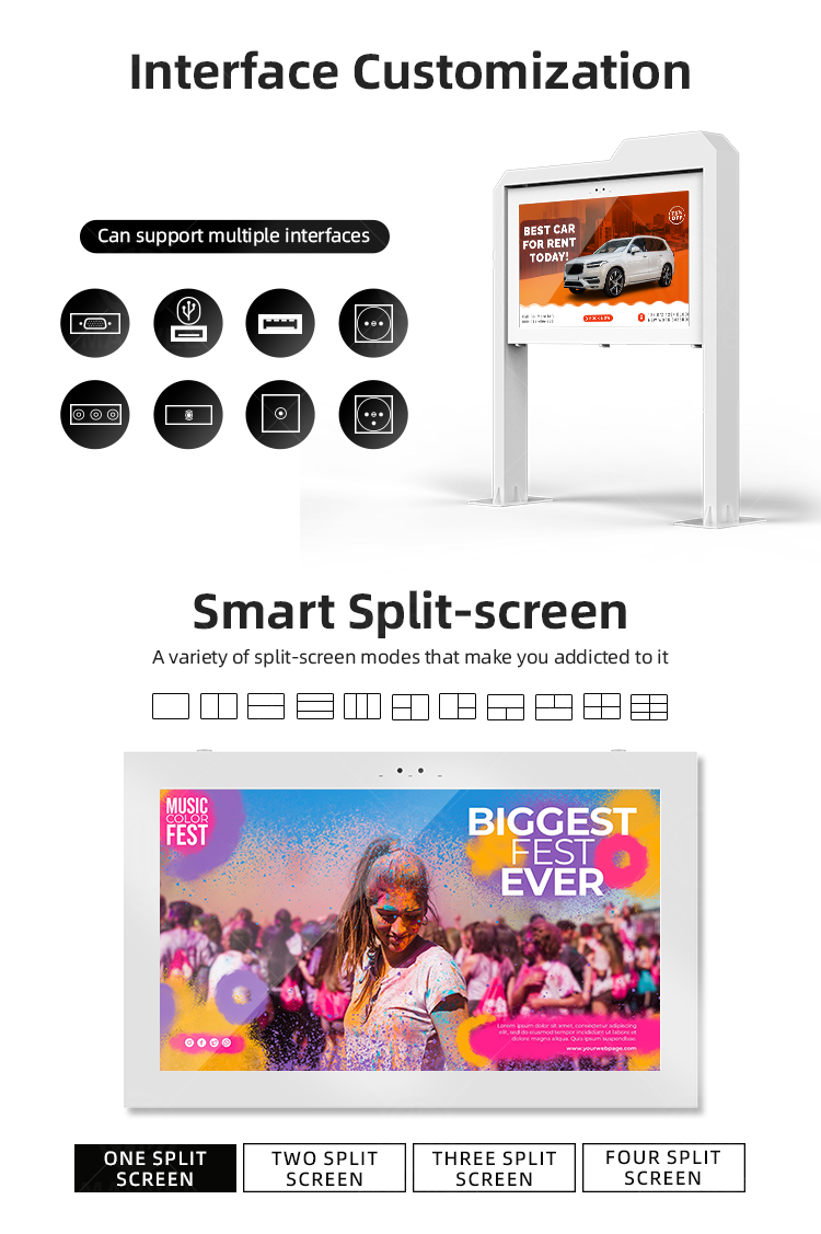 这款户外防水液晶数字标牌屏幕采用 IP65 防护等级设计,全天候可靠运行。它搭载 Android 操作系统,支持定制尺寸和时尚的图腾设计,适用于电梯、公园和博物馆等场所,提供高亮度、节能、智能的数字显示解决方案。