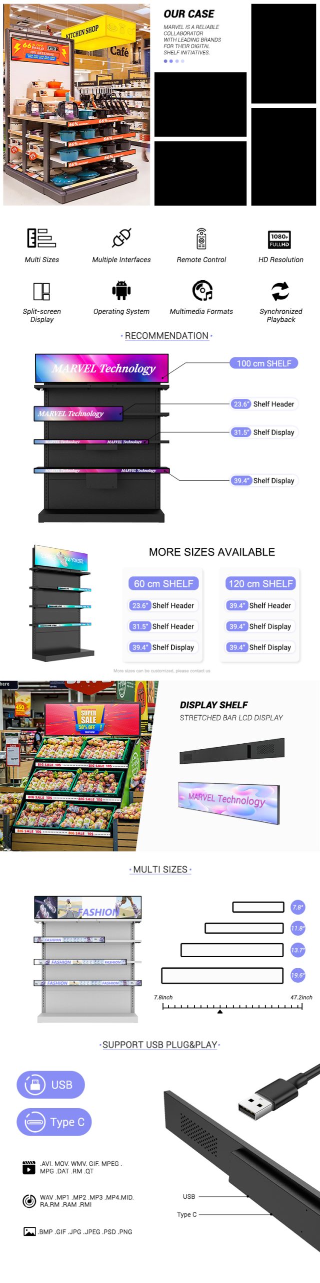 货架条形液晶显示屏采用纤薄可拉伸设计,亮度高,可在货架边缘清晰显示广告。它非常适合超市和餐厅,支持远程内容更新和尺寸定制,提供高效的数字化解决方案,提升产品可见度和顾客互动度。